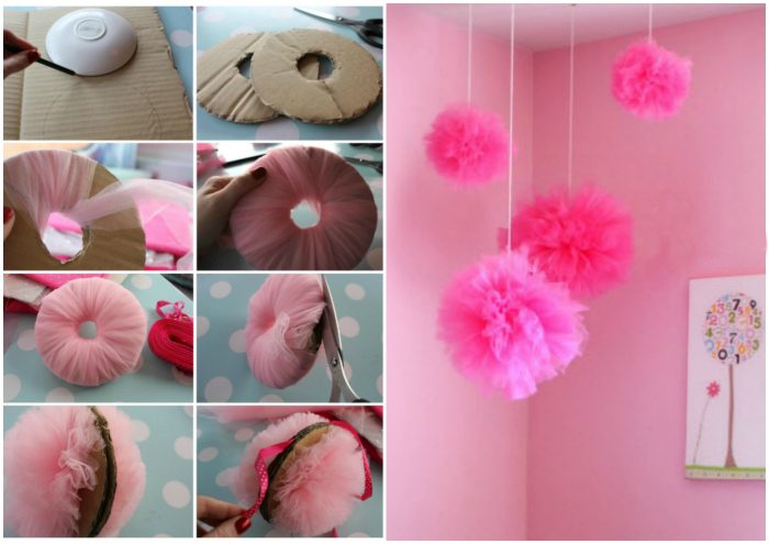 Фантастические помпоны, которые можно сделать своими руками из картона и яркого фатина, станут очаровательным украшением спальни маленькой принцессы или стильной деталью комнаты девочки подростка.