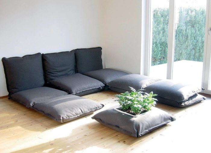 Подушки для сидения на полу.Если в квартире не хватает места, то подушки смогут заменить привычную мебель. В любой момент их можно убрать.