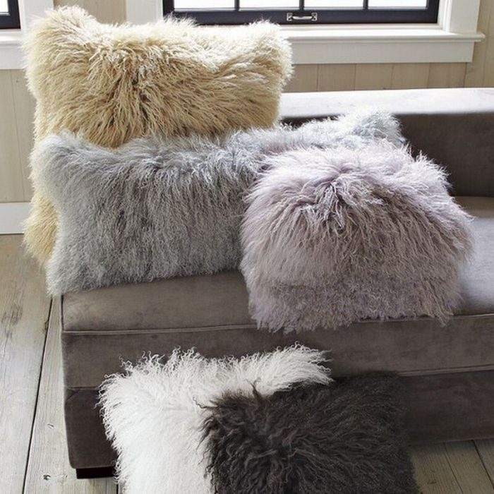 Меховые подушки в гостиной.Если обстановка выглядит монотонной, то эффектно оживить ее получится при помощи декоративных подушек с фактурными чехлами. Мех, вязаное полотно, бархат… Вариантов немало, и ничто не мешает использовать все эти материалы для чехлов одновременно.