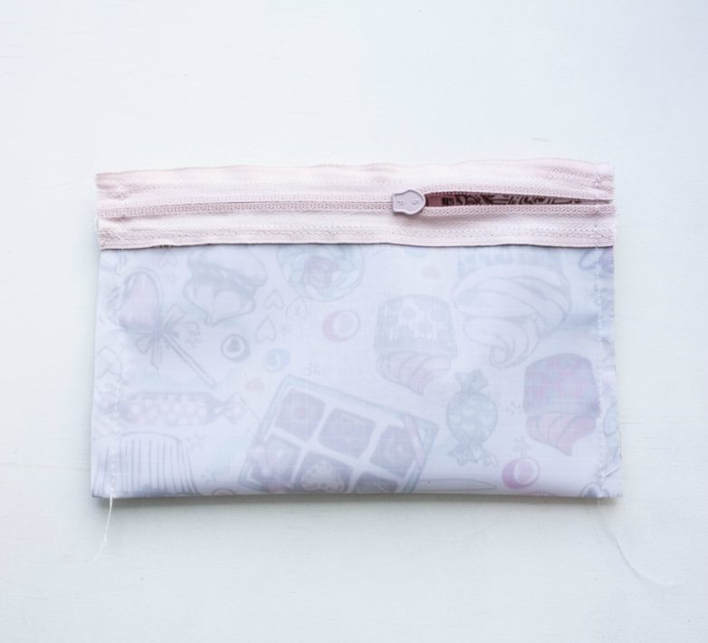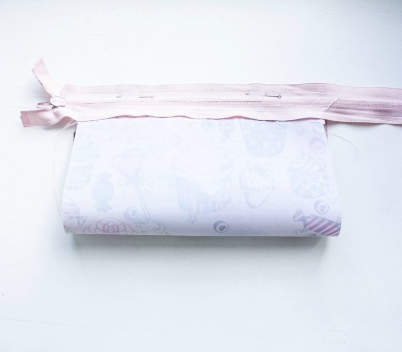 Складываем косметичку пополам с изнаночной стороны и сшиваем другой край молнии со свободным краем ткани.