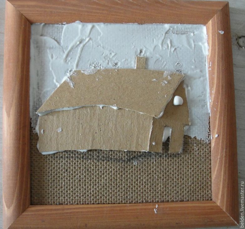 Далее наносим мастихином шпатлевочную смесь на работу начиная с неба. Щели около рамы заделываем. Особо разглаживать небо не надо. Дошли до домика. Если начали работать смесью, не отходите от работы на долго. Смесь через некоторое время начнет подсыхать.