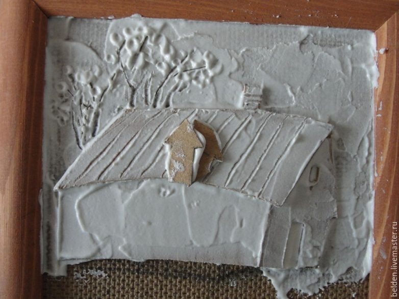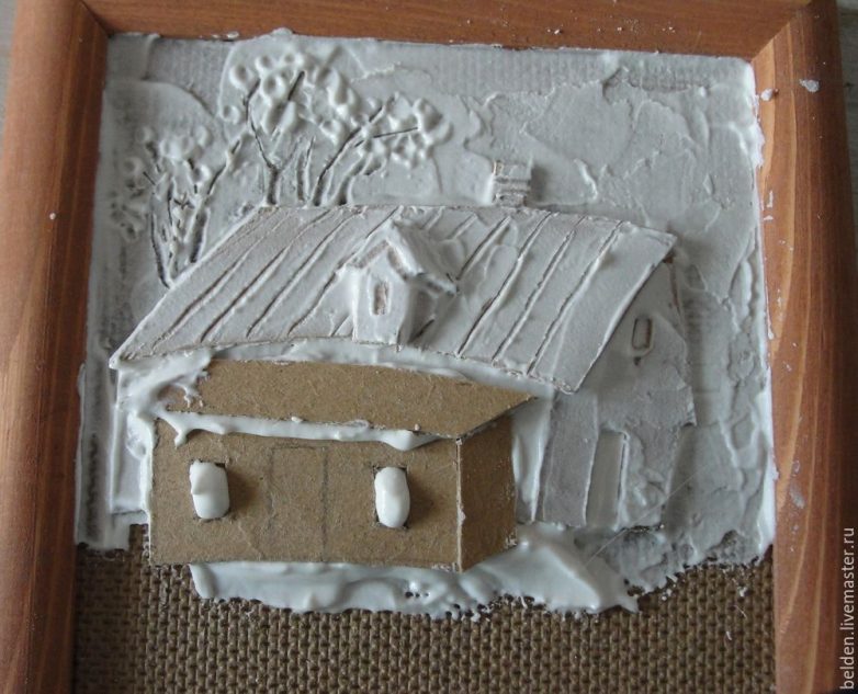 По выпуклым местам и снег протираем тряпочкой (для масляных красок). Белой краской прорисовываем детали: рамы окон, ветки, снежинки и снег. Темным цветом можно оттенить окна, крышу, шапки снега. Работа завершена. Осталось просушить.