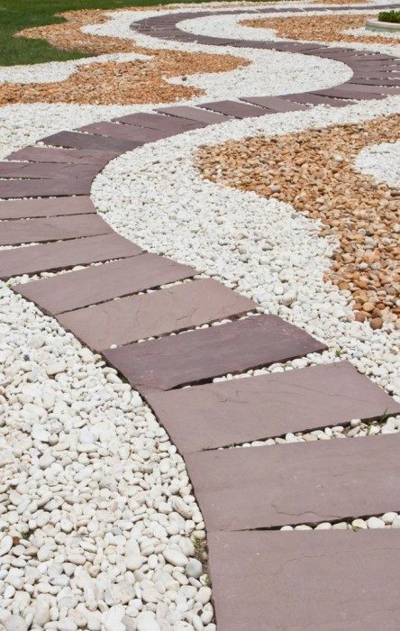 Садовая дорожка с узорами выложенная из мелкой гальки.