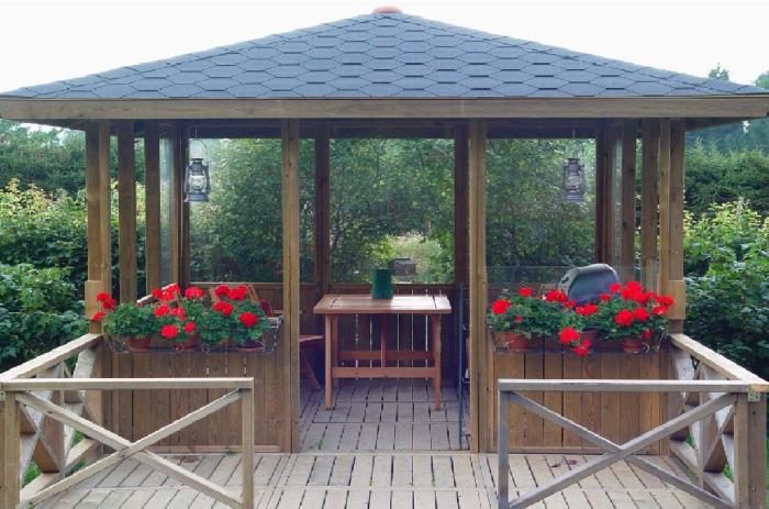 Простой тип полуоткрытой беседки для дачного участка.