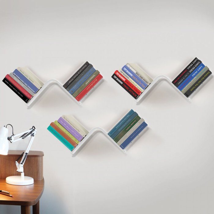 Небольшие настенные полочки для книг клиновидной формы.