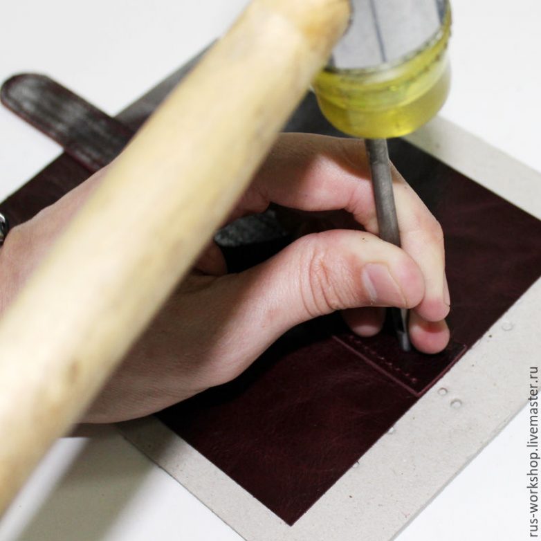 Переходим к установке фурнитуры. Отмерьте с помощью линейки у ровного края хлястика 14 мм, от края. И ровно посередине, с помощью пробойника 3 мм и молотка, сделайте отверстие.