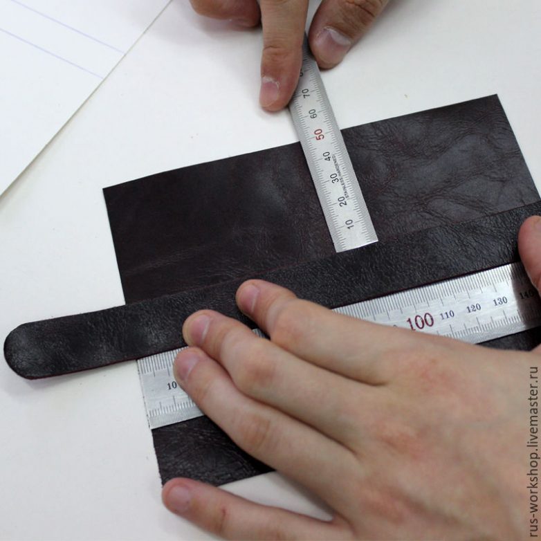 Возьмите кожу и положите на неё лекало. С помощью линейки ровно отрежьте крой. У вас должны получится 2 куска кожи для хлястика, 2 кармана, одна основа и 3 кармана для карт.