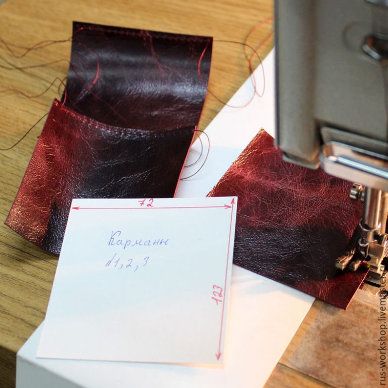 Для следующего этапа возьмите линейки, лекало кармана 123х72, двухсторонний скотч. Наклейте на все 3 кармана с обратной стороны скотч по трём сторонам. Ровно выставите лекало и кожаный карман, и по линейке наклейте первый карман. Пришейте его снизу. Тоже самое проделайте со вторым карманом. Когда наклеите третий карман, низ не пришивайте пока.