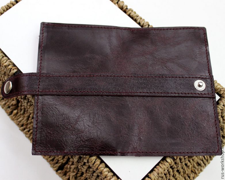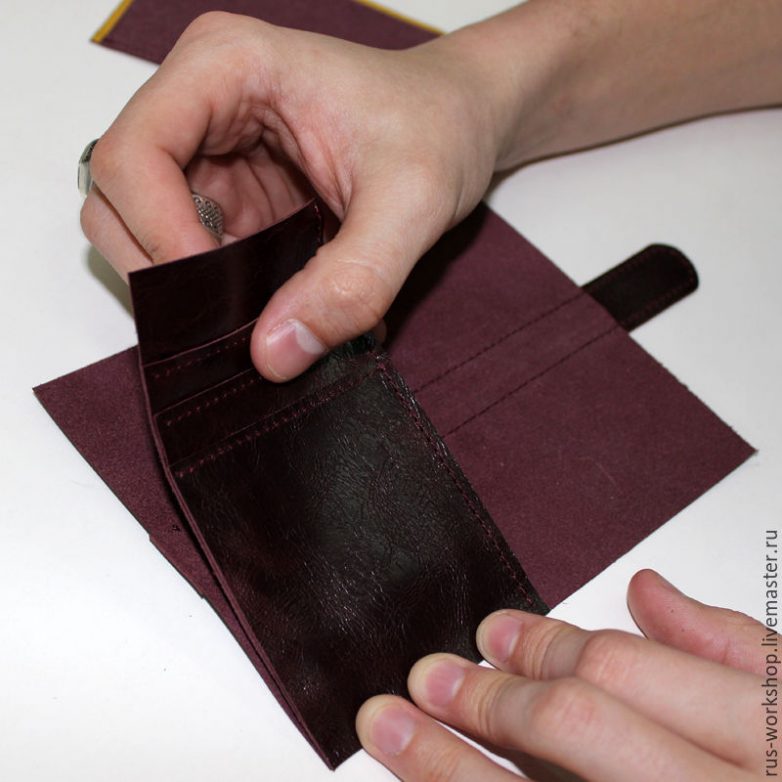 Идём дальше. На кожаную основу, нужно приклеить карманы. Наклейте двухсторонний скотч, по трём сторонам, и по очереди приклейте карманы. Со стороны хлястика карман простой, с другой стороны карман с кармашками для карт.