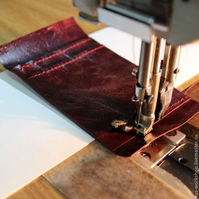 Далее берем кожаную основу, и ровно посередине отмечаем, где у нас будет хлястик. Наклеиваем его, и строчим на швейной машинке. Ровный край хлястика строчить пока не надо.
