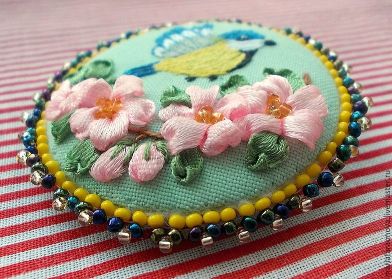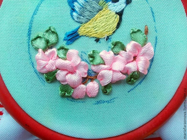 Розовую атласную ленточку вставляем в синельную иглу (либо просто иглу с широким ушком), делаем на конце плоский узел и вышиваем цветочки и бутоны прямым стежком. Стежки сильно не затягиваем, оставляя их объемными.
