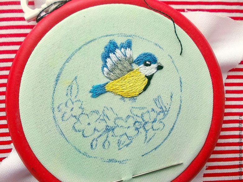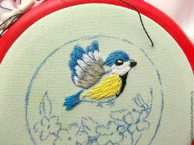 Птичка готова! Переходим к веточке. Коричневым мулине в две нитки (можно взять два оттенка коричневого) вышиваем веточку стебельчатым швом.