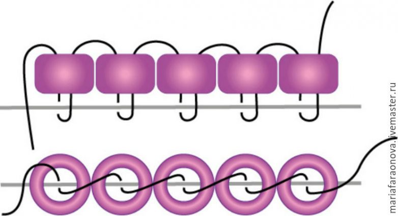 После этого вводим иглу в ту же самую бисерину и затягиваем. Повторяем действия: снова набираем одну бисерину, проводим через два слоя рядом с первой бисериной, вводим иглу в бисерину и т. д. Бисерины должны встать дырочками вверх.