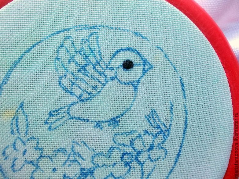 На ее основе я нарисовала схему. На кальке вычертила циркулем круг диаметром 5 см, птичку нужного мне размера перевела с экрана компьютера, внизу нарисовала от руки цветущую веточку с бутонами, после этого всё обвела маркером (чтобы удобно было переводить на ткань).