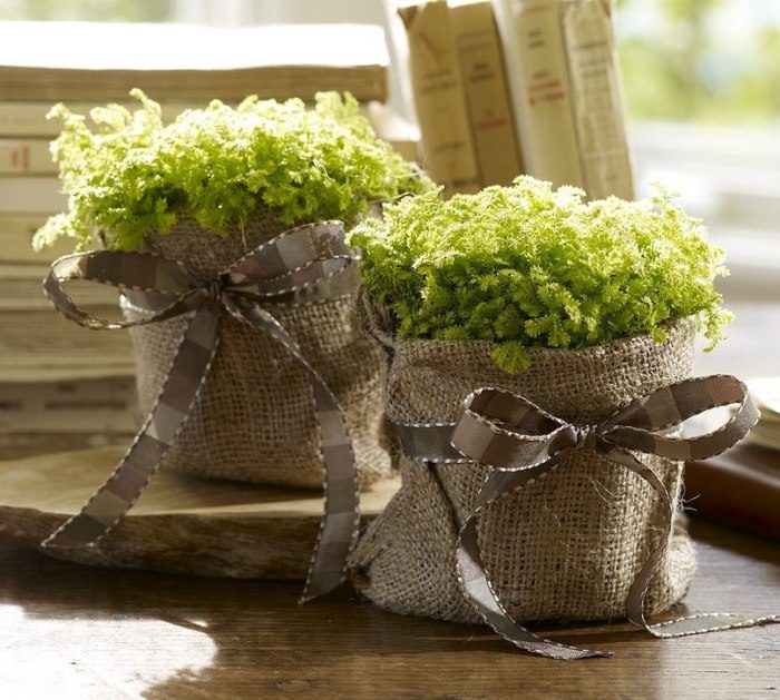 Цветочные горшки, обернутые мешковиной и перевязанные декоративным шнуром, станут украшением интерьера в стиле кантри.