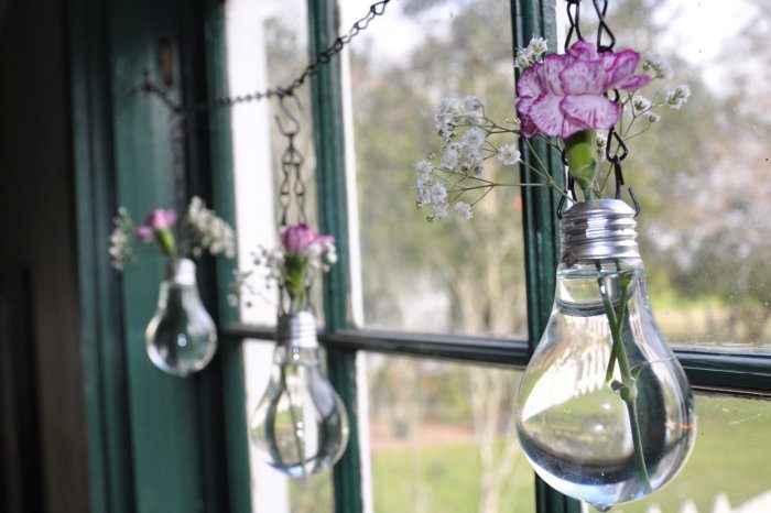 Декор для окна.Из обычных лампочек получится легко сделать декоративные кашпо для цветов. Просто просверлите в патроне отверстие и используйте лампочку в качестве миниатюрной вазы.