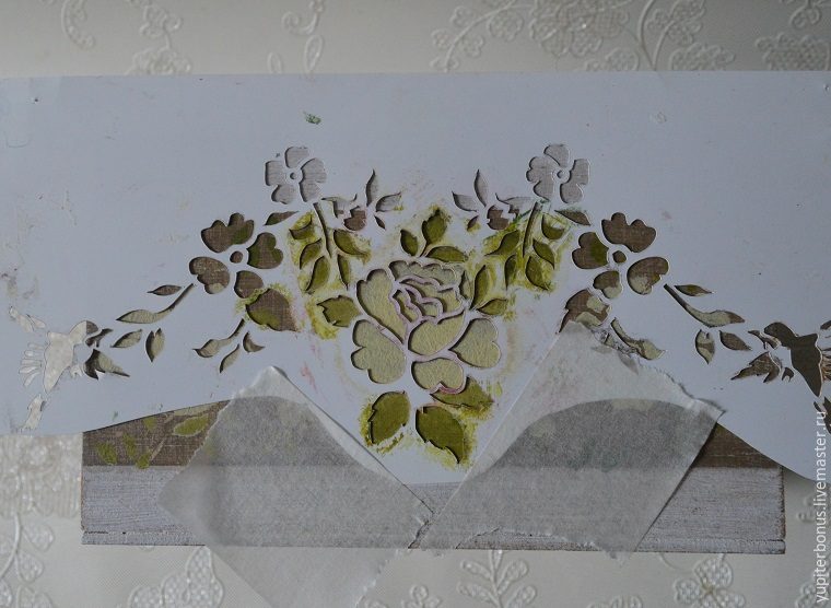 Я выбрала трафарет с розой, заклеила скотчем места, которые мне не понадобятся для нанесения краски, расположила и зафиксировала его в середине боковины (фасада).