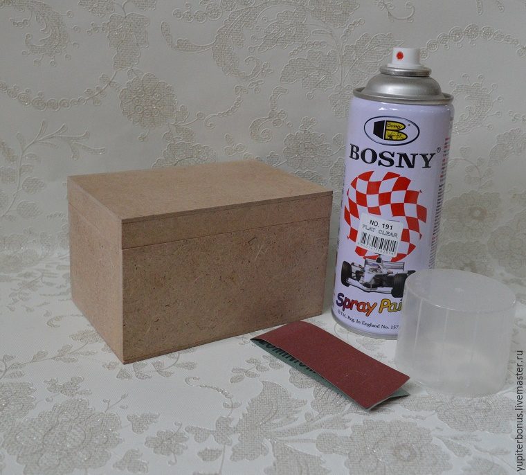 1. Подготавливаем заготовку к работе. У меня шкатулка из МДФ, поэтому я ее вначале ошкурила, затем покрыла лаком-спреем, предохранив таким образом ее от разбухания от акриловых материалов.