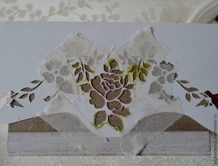 Хорошо сушим, выкладываем трафарет в разные стороны, «набивая» вначале светло-желтую и светло-зеленую краски. Заполняем все пространства мелкими элементами трафарета.