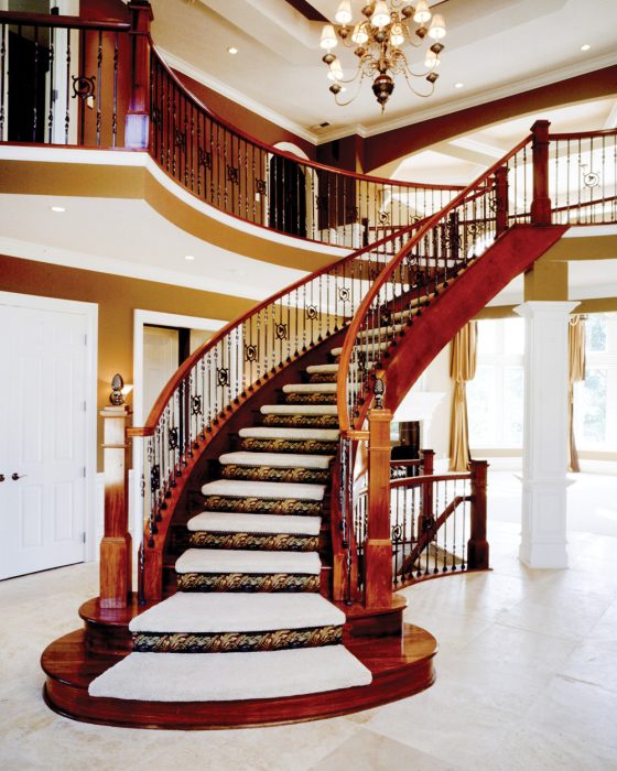 Аристократическая деревянная лестница ведущая на второй этаж в интерьере дома.