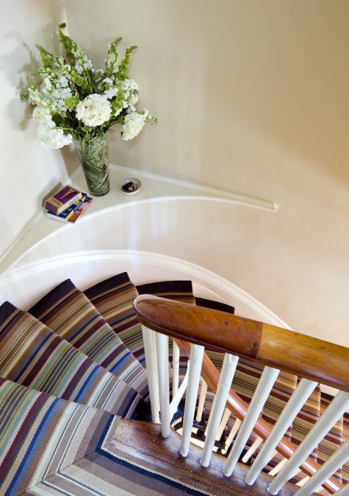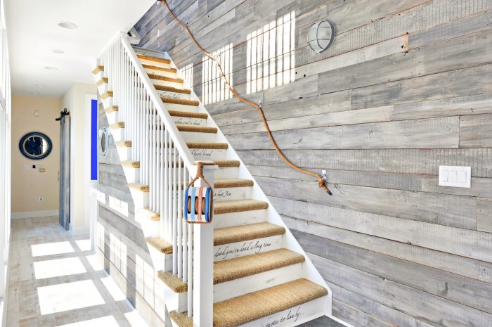 Деревянная лестница и окружающее пространство оформленное в морском стиле.