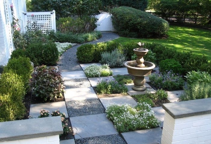 Квадратные дорожки из камня и гальки в интерьере садового участка.
