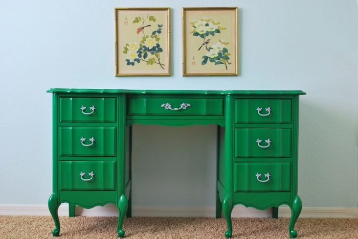 Простейший способ освежить винтажную мебель — просто перекрасить ее. Но предварительно нужно очистить поверхность от остатков лака и краски, нанесенных много лет назад. Это можно сделать при помощи шлифовольной машинки или наждачной бумаги. В некоторых случаях достаточно просто поддеть слои краски ножом, и они легко отойдут. Затем дерево нужно покрыть грунтовкой, и после ее высыхания — окрасить в яркий цвет.