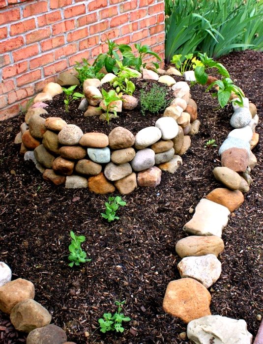 Обычные речные камни или гальку можно использовать для декора клумб и грядок. Рядочками камней можно разделить огород на секторы, отделить грядки от садовых дорожек и украсить цветочные клумбы.