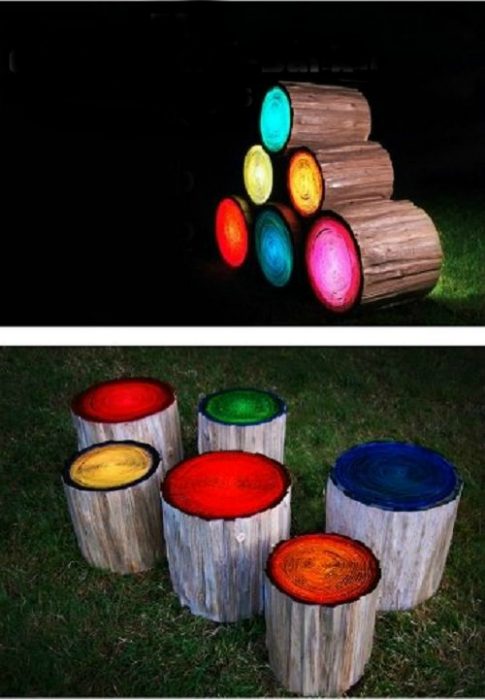 Срезы сухих пней можно покрасить флуоресцентной краской, которая заставит их светится в темноте. Такие пни можно использовать для создания оригинальных декоративных композиций или в качестве табуретов для гостей.