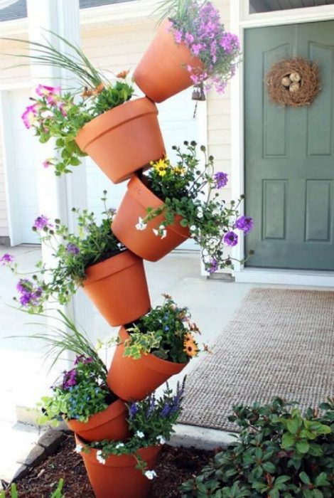 Из самых простых цветочных горшков, нанизанных особым образом на вкопанный в землю металлический прут, получится невероятное многоуровневое украшение, которое, несомненно, станет изюминкой придомовой территории.