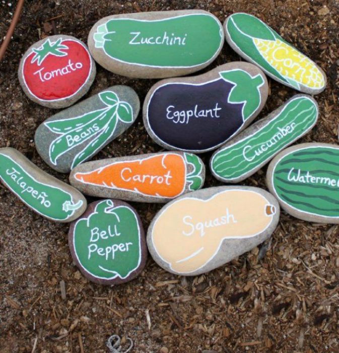 Чтобы огород был аккуратным и упорядоченным, маркируйте рассаду обычными речными камнями, украшенными соответствующими рисунками и надписями.