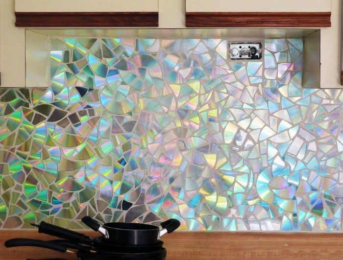 Ненужные компакт-диски можно использовать для создания невероятной мозаики, которая подойдет для оформления кухонного фартука.