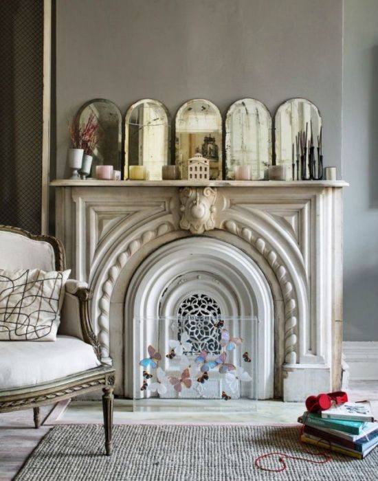 Зеркало, помещенное в камин, выглядит очень необычно. Такой декор еще и функционален — наличие отражающих поверхностей способствует визуальному увеличению комнаты.