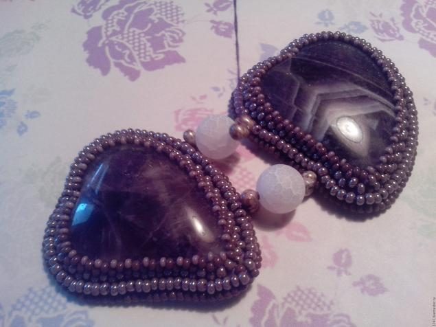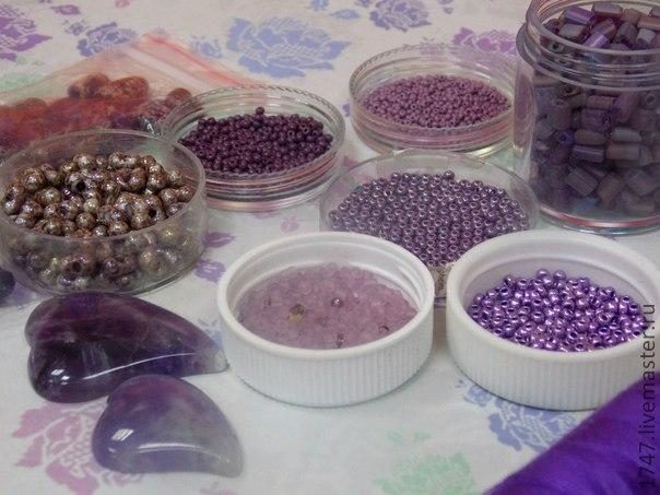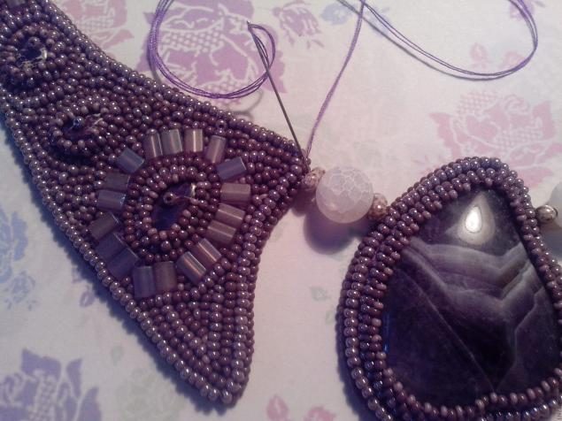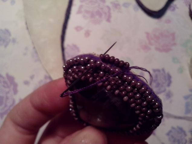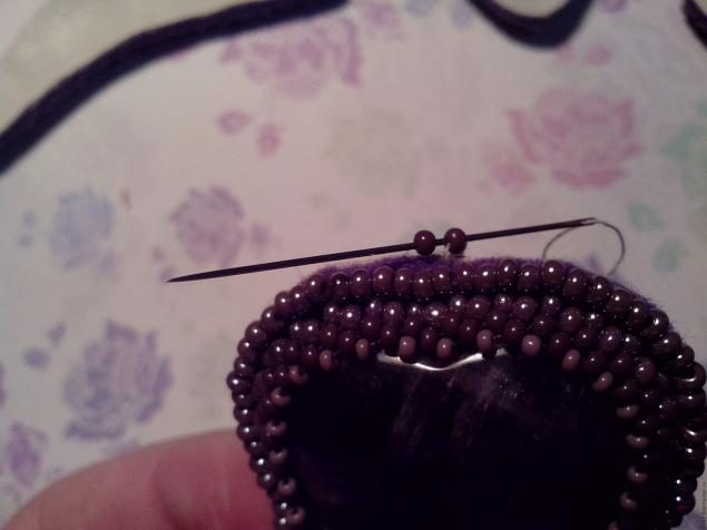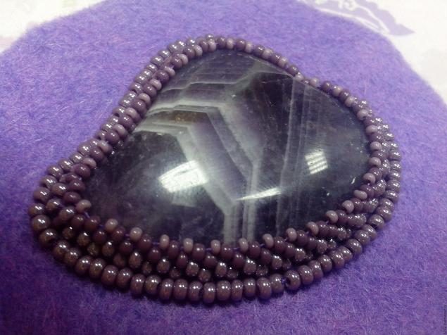 Далее начинаем оплетать наш кабошон: 1-ый ряд — сиреневый бисер с блеском, 2-ой ряд — сиреневый матовый бисер темного оттенка и 3-ий ряд мелкий светло-сиреневый бисер