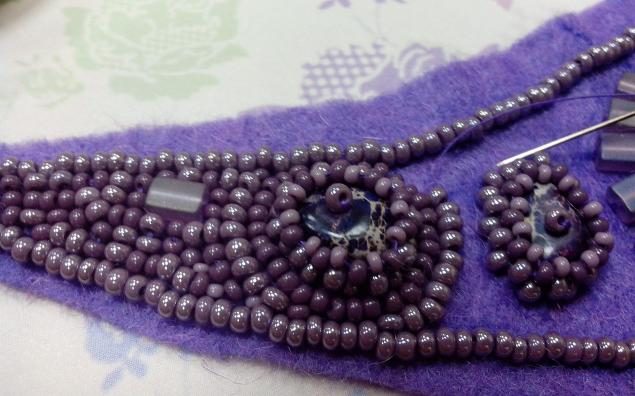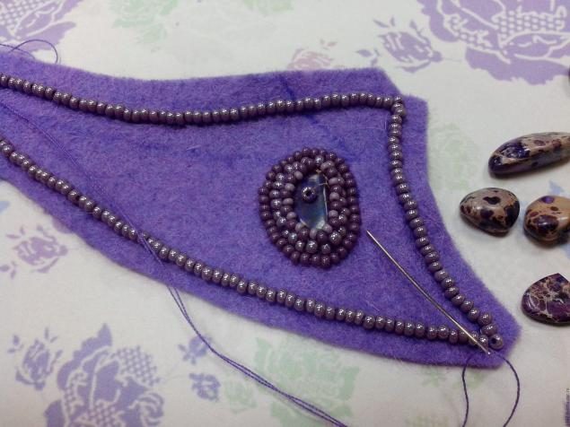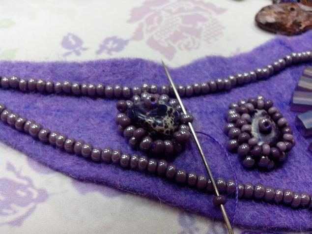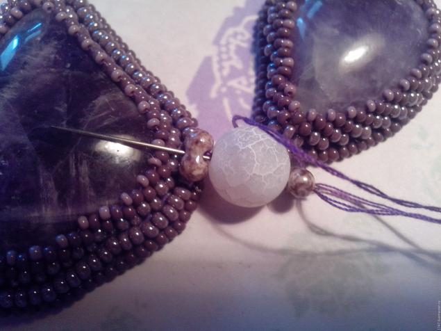 Затем приклеиваем бусины из варисцита и обшиваем таким же образом, как и аметисты