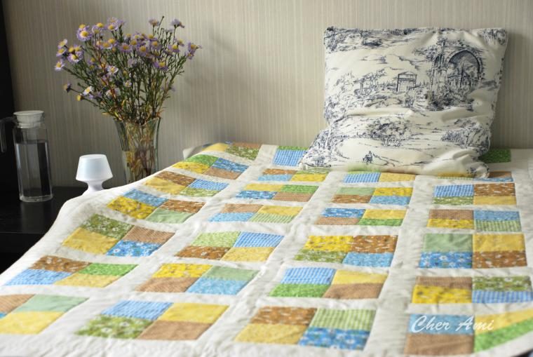 Такое одеялко советую сшить тем, кто хочет попробовать себя в лоскутном шитье. Размер готового одеяла 97 х 157 см.