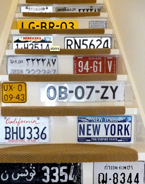 На самом деле, при украшении лестницы можно проявить недюжинную креативность. К примеру, к каждой ступеньке данной лестницы прикреплен автомобильный номерной знак.