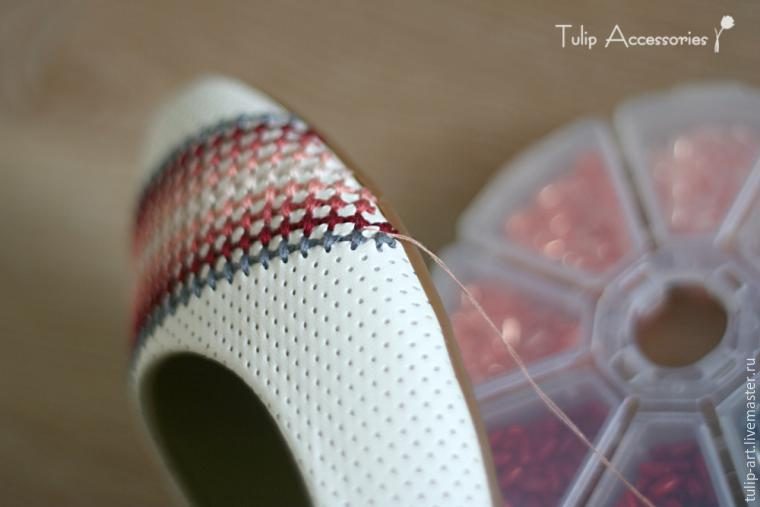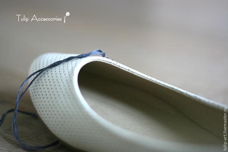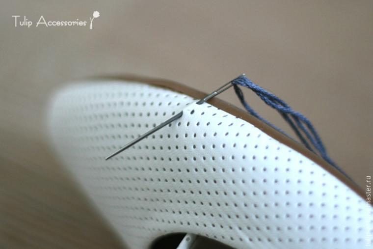 Теперь приступаем к вышивке. Это будет самый обыкновенный крестик. Я хотела получить фактурные крупные стежки, поэтому заправила в иглу сразу две нити. Начинаем ряд со стороны, противоположной той, с которой отклеена стелька. Вкалываем иголочку в тапочек не прокалывая подкладку, только через наружный слой кожи до(!) внутреннего. Это позволит нам избежать появления изнанки шва с внутренней стороны балетки.