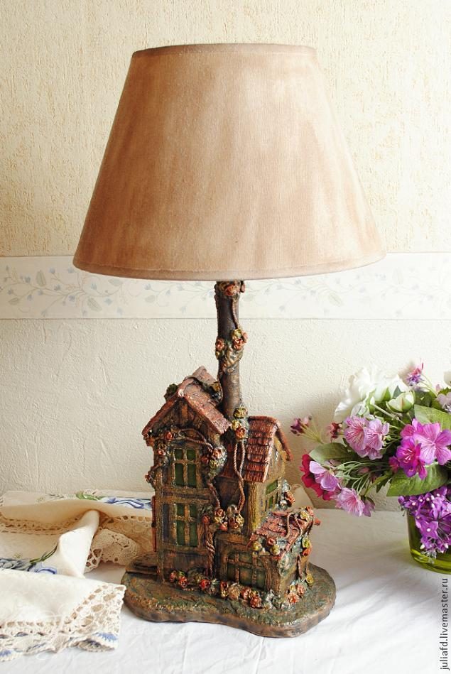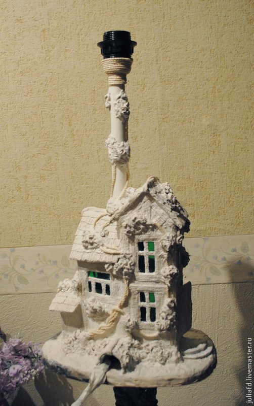 Когда наш дом готов, нам нужно украсить его цветами, сделать дорожку из камушков и травку вокруг дома. Я увиваю свой дом розами. Для ветвей я беру крученую хозяйственную веревку. На клей ПВА клею кусочки веревки, имитирующие плетистые розы, к стенам нашего дома. Далее из гипсового бинта формирую зелень, розочки, травку вокруг дома. Для дорожки нам опять пригодится штукатурка. Накладываем ее толстеньким слоем, разравниваем и наносим насечки в виде отдельных камушков. Теперь ждем полного высыхания. На этом же этапе монтируем электрику, закрепляем патрон на трубке, декорируем его основание.