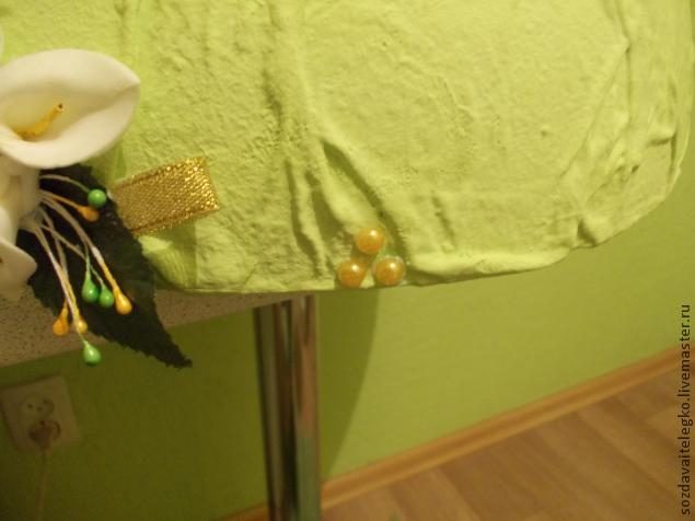 В процессе оклеивания тканью, верхнее отверстие, где крепится ножка, закрылось, поэтому его нужно прорезать: