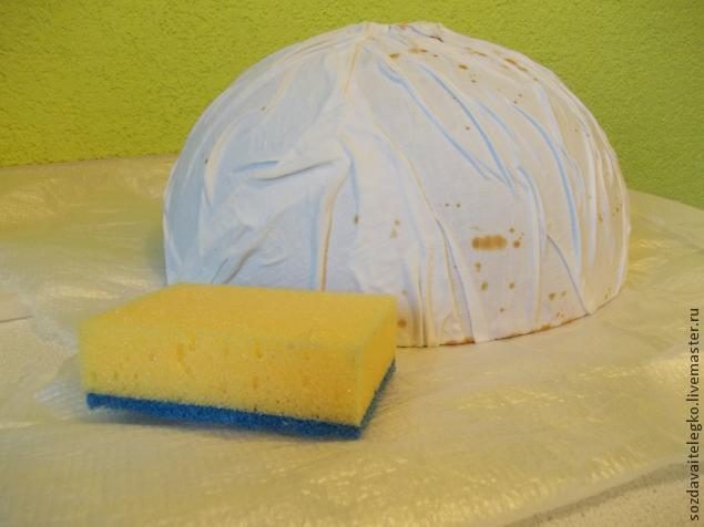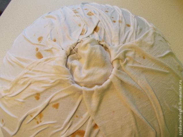После полного высыхания грунтовки (24 часа), можно приступить к обклеиванию нашей лампы тканью. У меня была задумка сделать складки из ткани.