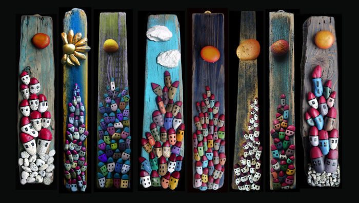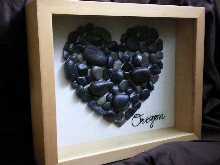 Картины из камней.Галька становится альтернативой краскам, использующимся для написания картин. Галька, окрашенная в нужные цвета, используется в качестве элементов для декоративной композиции на настенном панно. Камни приклеиваются на текстильную или деревянную основу, помещенную в раму.