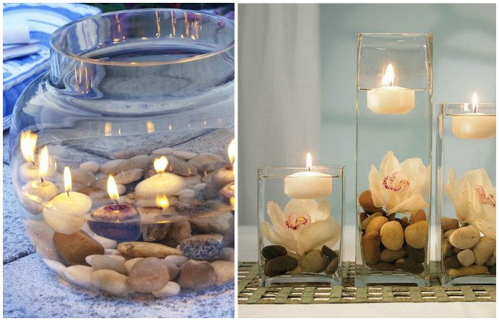 Полностью безопасные, а главное, эстетичные подсвечники можно сделать из обычных стаканов и гальки. Просто поместите свечку среди камней, и она будет надежно удерживаться камнями в вертикальном положении.
