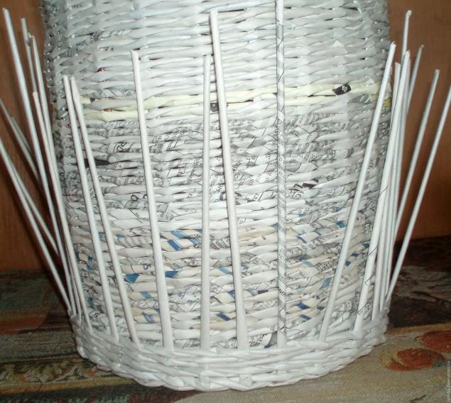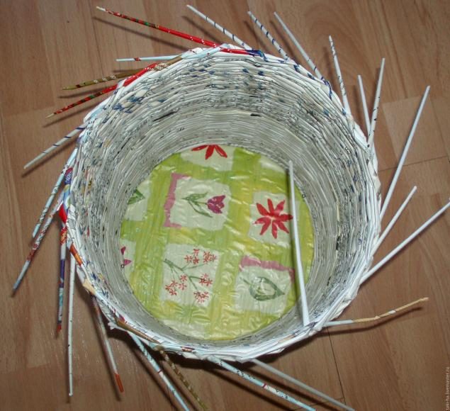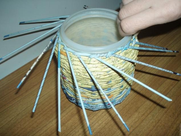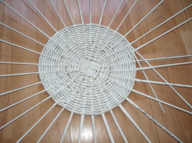 Плетем еще 4-5 рядов и теперь еще раз разводим трубочки, теперь уже оплетая каждую отдельно. Дальше плетем крышку до размеров диаметра нашего короба (25см).