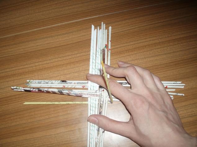Берем 16 трубочек укладываем их вот таким образом в группы по 4 трубочки. Крепко держим пальцами по центру, чтобы трубочки на рассыпались, можно их слегка примять.