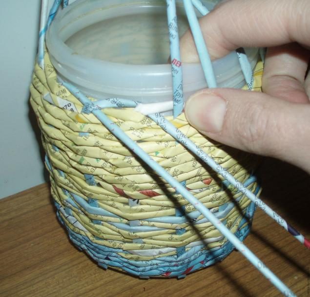 Подклеиваем между двумя кругами 2 рабочих трубочки и начинаем оплетать стойки, тем самым поднимая их в стоячее положение, проплетаем первый ряд и вставляем внутрь форму, которая обеспечит нам ровное плетение (без формы изделие может перекоситься или заузиться к верху).