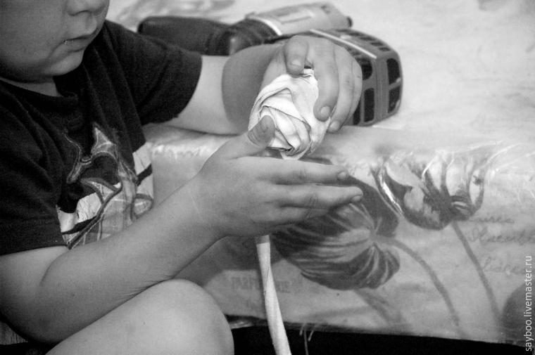 Пока вы режете на лоскуты все, что только попадается под руки, детям можно предоставить их часть работы, сматывать в клубки нарезаные нитки: