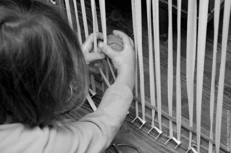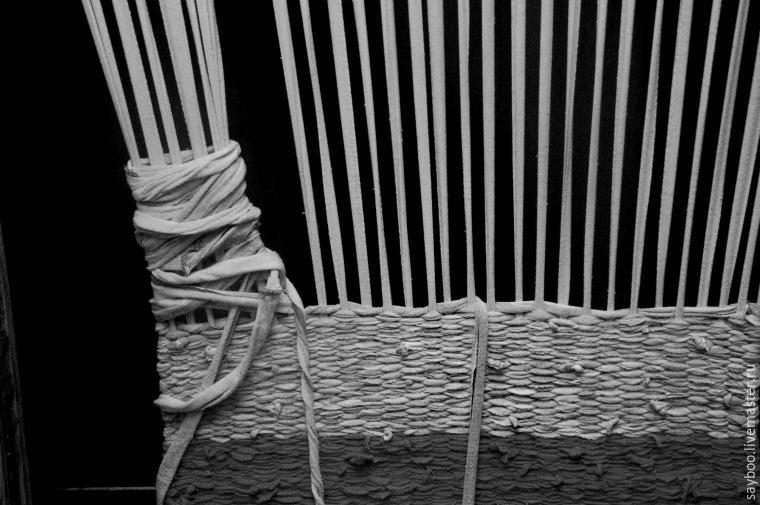 Здесь и дальше я предлагаю перейти на черно-белый формат, когда будут вечерние фото, чтобы не травмировать вас беспощадным рыжим цветом. Все потому что занятие это, домоткачество, настолько медитативное и расслабляющее, что им сам бог велел заниматься вечерами. И мы эти вечера проводили с большим удовольстивем за станком. Но увы, деревянный фон и плохое освещение с успехом сделают из любой фотографии шикарное рыжее нечто.
