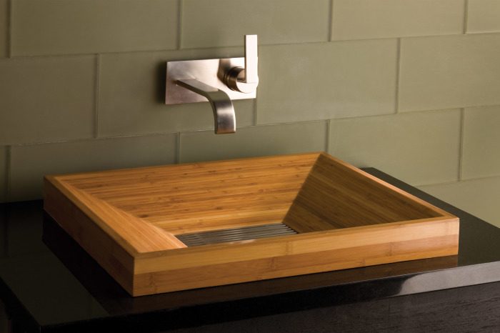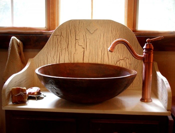 Деревянная раковина может стать отличным дизайнерским решением в ванной комнате.