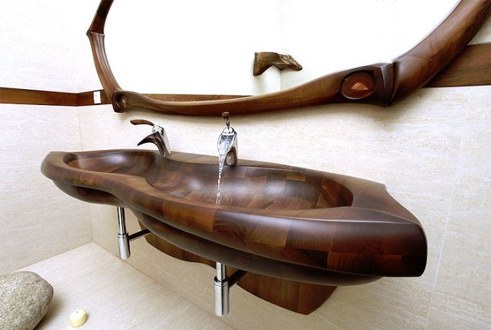 Раковина из цельного куска древесины, которая отлично впишется в интерьер ванной комнаты.